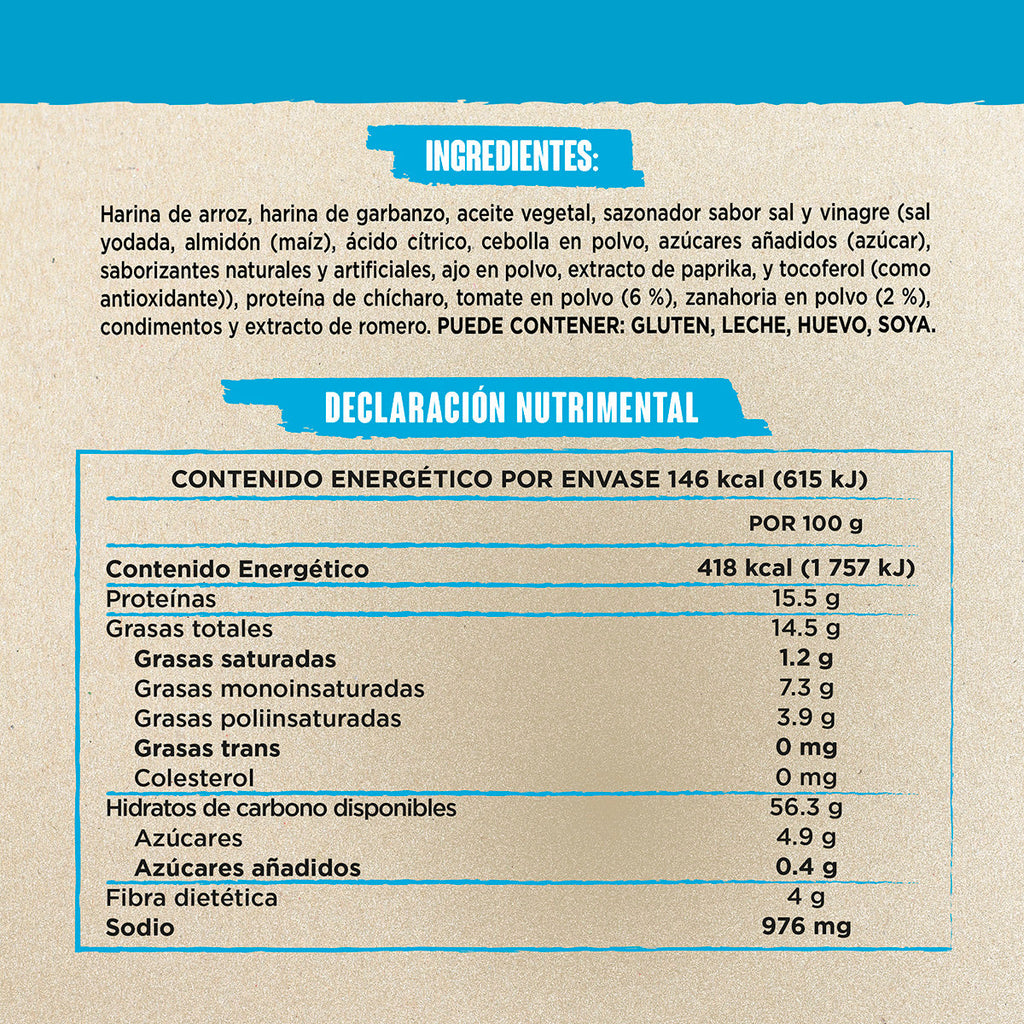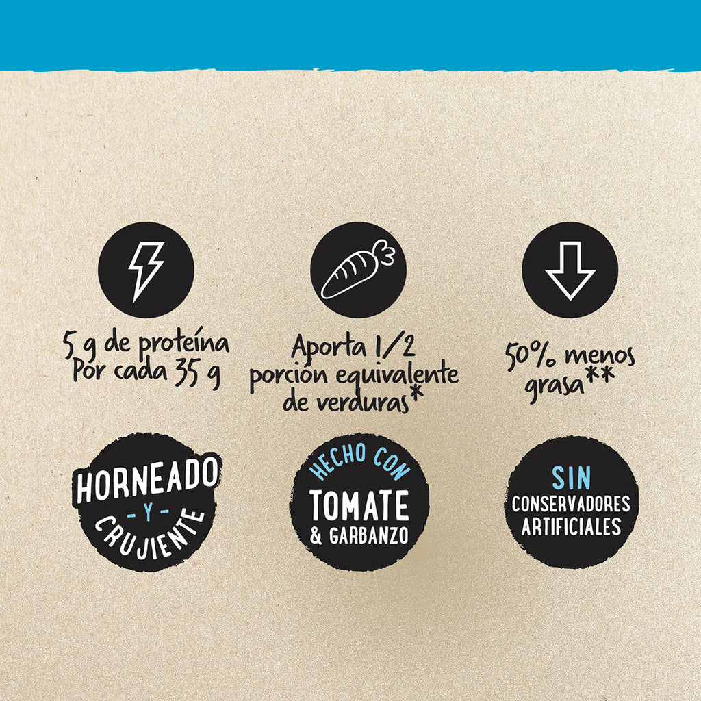 Disfruta de un snack crujiente, nutritivo y lleno de sabor con nuestros Veggie Crunch Sal y Vinagre 35g Snack'in For You con su forma perfecta para dippear. Hechos con tomate, garbanzo aportando media porción equivalente de verduras y 5g de proteína. ¡Sabor y energía con 50% menos grasa! * Que una papa frita con sal.